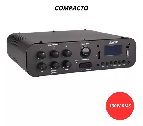 O Amplificador de Potência para Som Ambiente SA20 é a escolha perfeita para quem busca praticidade e qualidade em sistemas de som para pequenos e médios ambientes. Com 100W RMS de potência, ele é capaz de conectar até 20 caixas de som, ideal para sonorizar espaços como escolas, supermercados, escritórios e lojas com clareza e eficiência.